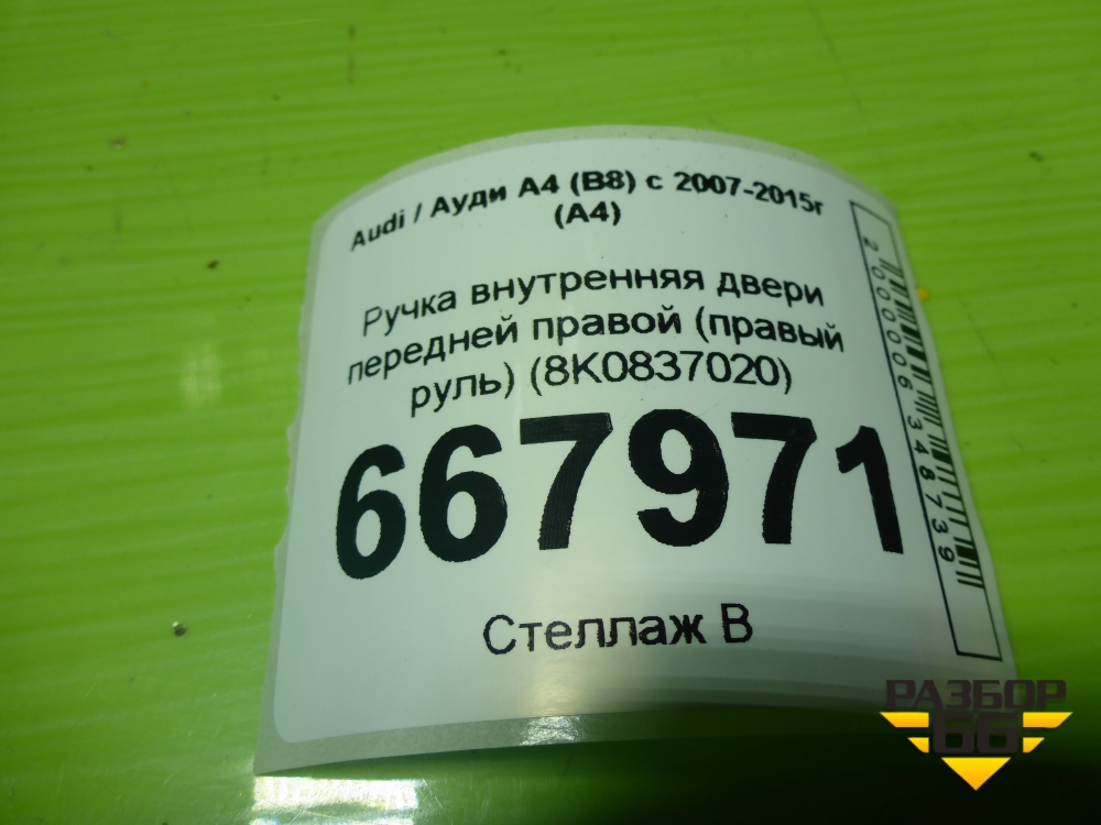 Ручка внутренняя двери передней правой (правый руль) (8K0837020) для Audi A4 (В8) с 2007-2015г (А4) в Уфе