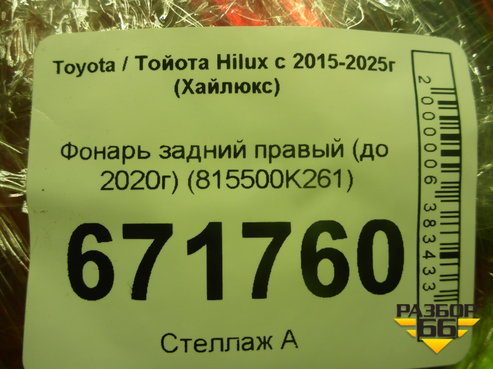 Фонарь задний правый (до 2020г) (815500K261) для Toyota Hilux с 2015-2025г (Хайлюкс) в Уфе
