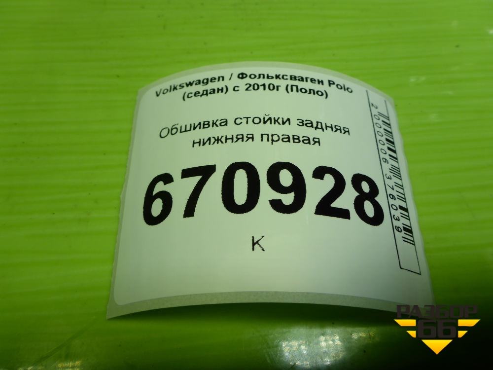 Обшивка стойки задняя нижняя правая (6RU867766) для Volkswagen Polo (седан) с 2010г (Поло) в Уфе